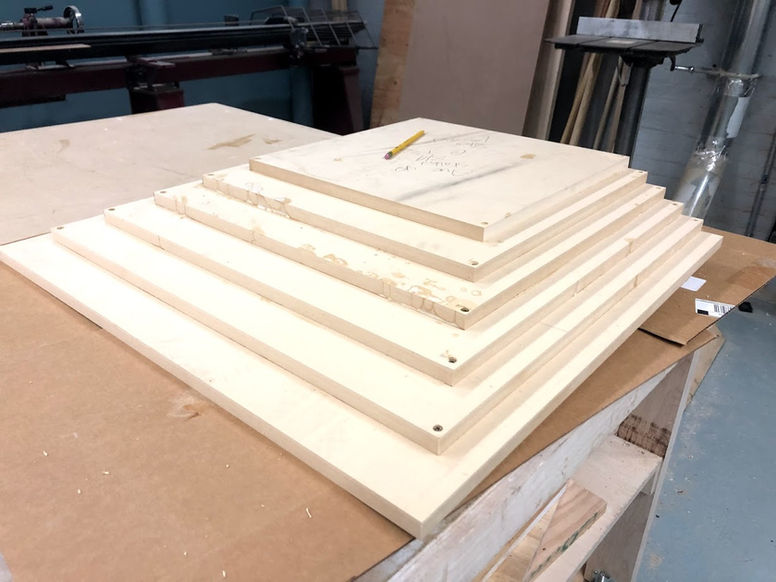 Design: I wanted to see what I could get out of a single 8'x4' sheet of MDF. I started with a sketch of these dimensions in Fusion 360, and from there created some parametric rectangles, that diminished in size, to see how many I could fit onto the sheet. I took those shapes and extruded them on top of each other to create a pyramid shape. It started to look like an X-Wing cockpit so I took the design in that direction. I was able to quickly get a model of the 2D contours, the glued up stock as well as the final object to overlay and import them into MasterCam. The CAM was quite straight forward 3-axis contours for the initial shapes and 3+2 programming for the final piece. The 5-axis machining started with an adaptive roughing cycle and finishing with 2D contours, normal to the objects faces. If I was to do it again I would have incorporated some swarf cuts to spice things up.